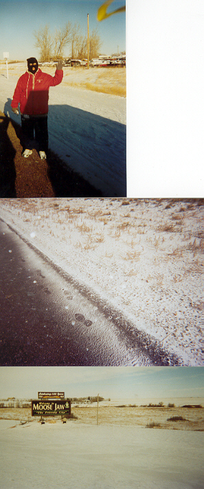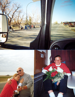 October 30 - Extreme cold, 90 km/hr winds, and snow are what Lori is facing every day. That plus her MS symptoms, pain, and difficulty sleeping at night are plaguing her at this point in the Trek. Every morning is a mental battle to get going. She is only able to walk about a half an hour at a time and must rest for longer periods. Many people in large and small ways are showing their support and keeping her going. Fern sent her a dozen red and white roses via her friend Roger. Members of a nursing home in Virden (many of whom have MS, including Della's sister Lois) walked a stretch of the road with Lori. People are coming forward with money to give Lori and Chris hotel accommodations. Drivers, especially truck drivers, are slowing down and pulling to the left to give Lori lots of room and keeping her from getting a face full of snow! This is especially appreciated as the road conditions are worsening. Lori watched in horror as one pickup slid off the road right in front of her, drove out of the ditch, and roared off again. A little too close for comfort! |