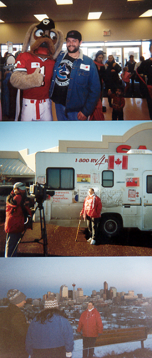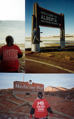 November 20 - Medicine Hat, Alberta - 5000km!!!! Well the weather in Alberta has so far been a bit better, but because we are now on Mountain Time we have lost an hour of daylight every day. It is harder trying to squeeze in the kilometers before dark. On the bright side (no pun intended) the local radios having been providing tons of support and alot of people are waving and honking as they pass Lori on the road. November 24 - Bassano - 5,200 km