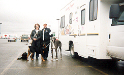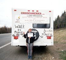 I (webmaster) received an e-mail from Armand Lebel and Julie Gendron from Grand Falls, New Brunswick. He writes, "I have met Lori in person last night, on the 16 of May, 2003. Me and my girlfriend Julie Gendron have given her 20 dollars donation and where my girlfriend works at Antlantic SuperStore, their staff fund has given her 200 dollars of donation. She took off from Grand Falls around 2:30pm this afternoon May 17 2003." Thanks, Armand and Julie for the update. Chris and Lori have called me on the phone and they said the Superstore invited them in for coffee! Thanks for the hospitality and the donations! Lori is tired and "finding her stride", but all of you can give her great encouragement! Today she has reached the 500 km mark and together with Chris lit sparklers to celebrate! |