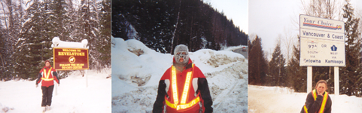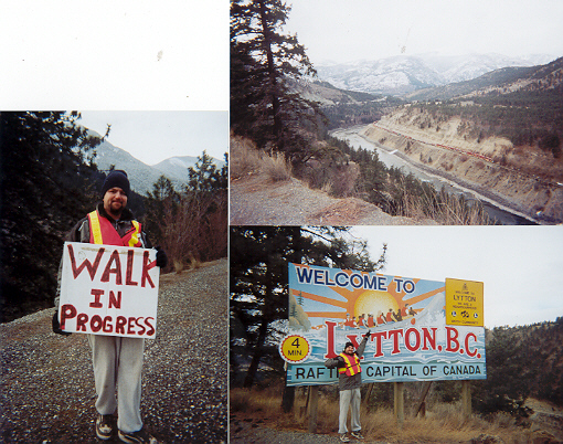 January 1, 2004 - Revelstoke - 5695 kms - Happy New Year's from Lori and Chris! Lori says, "The mountains are truly inspiring. They also command a great respect, as the Park Rangers have asked I check in with them every day because of their concern for avalanches along my route through the Rogers Pass. It's still very cold, but my latest challenge is staying dry as I walk. The high humidity combined with my exertion makes it tough, and being wet is not good when it is -15C!"