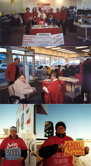 October 30 - Extreme cold, 90 km/hr winds, and snow are what Lori is facing every day. That plus her MS symptoms, pain, and difficulty sleeping at night are plaguing her at this point in the Trek. Every morning is a mental battle to get going. She is only able to walk about a half an hour at a time and must rest for longer periods. Many people in large and small ways are showing their support and keeping her going. Fern sent her a dozen red and white roses via her friend Roger. Members of a nursing home in Virden (many of whom have MS, including Della's sister Lois) walked a stretch of the road with Lori. People are coming forward with money to give Lori and Chris hotel accommodations. Drivers, especially truck drivers, are slowing down and pulling to the left to give Lori lots of room and keeping her from getting a face full of snow! This is especially appreciated as the road conditions are worsening. Lori watched in horror as one pickup slid off the road right in front of her, drove out of the ditch, and roared off again. A little too close for comfort! |