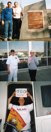 I (webmaster) received an e-mail from Armand Lebel and Julie Gendron from Grand Falls, New Brunswick. He writes, "I have met Lori in person last night, on the 16 of May, 2003. Me and my girlfriend Julie Gendron have given her 20 dollars donation and where my girlfriend works at Antlantic SuperStore, their staff fund has given her 200 dollars of donation. She took off from Grand Falls around 2:30pm this afternoon May 17 2003." Thanks, Armand and Julie for the update. Chris and Lori have called me on the phone and they said the Superstore invited them in for coffee! Thanks for the hospitality and the donations! Lori is tired and "finding her stride", but all of you can give her great encouragement! Today she has reached the 500 km mark and together with Chris lit sparklers to celebrate! |