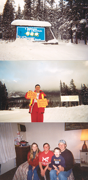 January 1, 2004 - Revelstoke - 5695 kms - Happy New Year's from Lori and Chris! Lori says, "The mountains are truly inspiring. They also command a great respect, as the Park Rangers have asked I check in with them every day because of their concern for avalanches along my route through the Rogers Pass. It's still very cold, but my latest challenge is staying dry as I walk. The high humidity combined with my exertion makes it tough, and being wet is not good when it is -15C!"